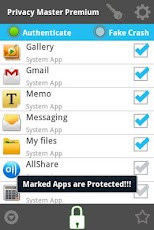 pmplock on contacts gallery usb - Starts Protection and will lock "contacts","gallery" & "usb" along with the preselected apps pmplock on fake gmail - Starts Protectionand will display crash message when someone opens gmail and the preselected apps